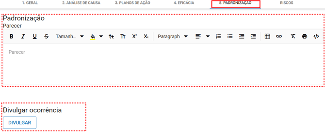 Para realizar a etapa de padronização e divulgação é necessário que o usuário seja responsável pela etapa, ouresponsável pela ocorrência ou que possuam a permissão “Editar todas”. Definida nas Configurações > Papel e permissão.