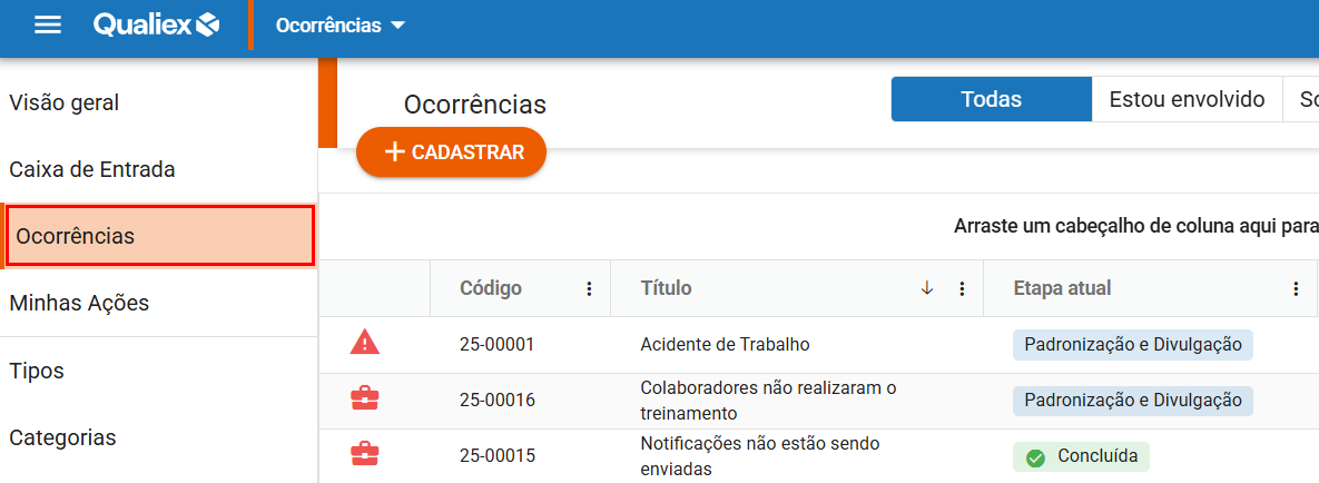 Na aba “Ocorrências” do módulo, clique para visualizar as ocorrências registradas.