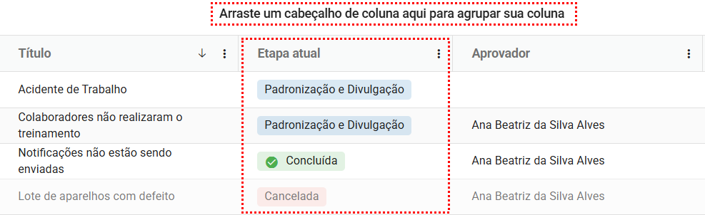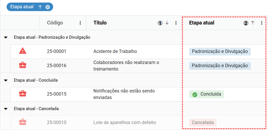Solte o cabeçalho nesse local e, automaticamente, as ocorrências serão organizadas conforme a coluna selecionada. Veja a seguir um exemplo de agrupamento pela coluna de etapas.