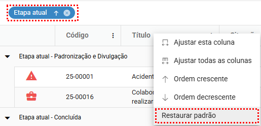 Para desfazer o agrupamento, basta clicar no “x” ao lado da coluna agrupada ou, clicando com o botão direito do mouse sobre a coluna, selecionar “Restaurar padrão”. Assim, o agrupamento é removido e a ordenação volta ao formato anterior.