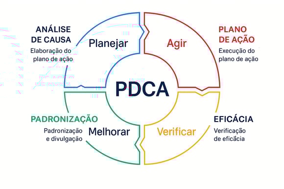 Para tratativa das ocorrências utilizamos o modelo PDCA, nesse guia vamos ver quais as etapas para realizar a tratativa da ocorrência. Vamos te guiar com links de artigos do Blog da Qualidade e do Ferramentas da Qualidade para te dar mais informações e conteúdos. A primeira etapa é a de avaliação e aprovação da ocorrência e após aprovada podemos seguir com a tratativa. Veja na imagem abaixo como as etapas da tratativa do módulo de Ocorrências estão dividas no PDCA.