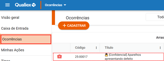 Ao acessar a Caixa de Entrada para aprovar ou cadastrar ocorrências, você pode indicar que a ocorrência deve ser marcada como confidencial. Apenas o responsável pela ocorrência, os responsáveis por cada etapa e os usuários com permissão de acesso à ocorrência confidencial conseguem visualizar esse tipo de ocorrência.