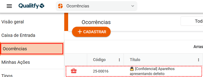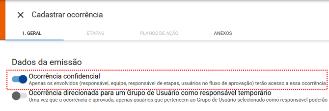 Apenas o responsável pela ocorrência, os responsáveis por cada etapa e os usuários com permissão de acesso à ocorrência confidencial conseguem visualizar esse tipo de ocorrência.