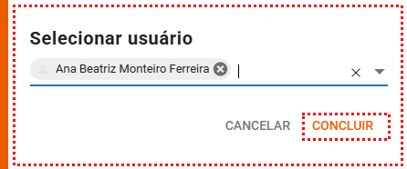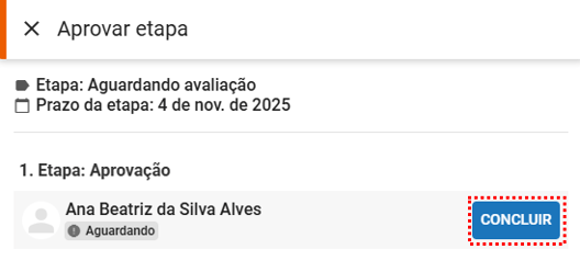 Após selecionar o usuário responsável pela aprovação da etapa, clique em "Concluir". O colaborador escolhido será designado para a etapa e poderá, então, aprovar ou reprovar diretamente ao clicar em "Concluir" na etapa correspondente.