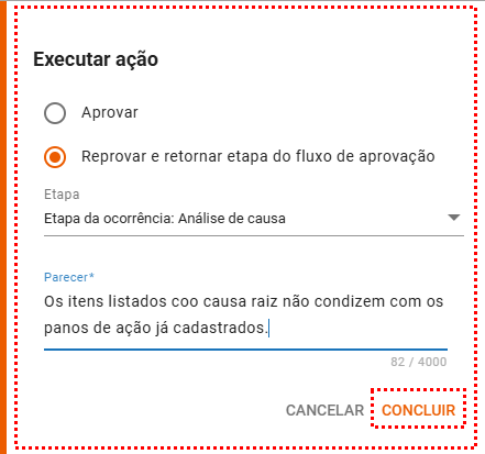 Ao selecionar “reprovar e retornar etapa”, é necessário registrar um parecer e indicar para qual etapa a ocorrência será devolvida. É fundamental detalhar de forma clara o motivo da reprovação para que a pessoa responsável pelos ajustes possa agir de maneira direcionada e eficiente. Após executar a ação, basta clicar em "Concluir".