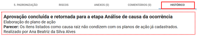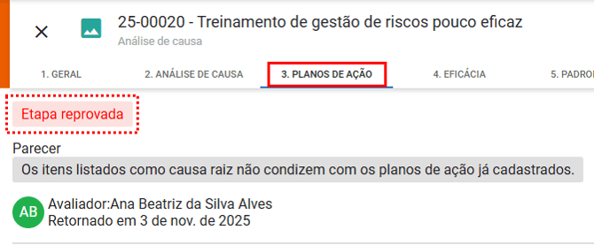 Ao utilizar a função de fluxo de aprovação entre as etapas das ocorrências é possível aprovar ou reprovar o avanço da mesma, ela funciona como uma verificação do que foi feito e registrado na etapa. Quando tudo está nos conformes, podemos aprovar e seguir o fluxo. Caso contrário, podemos reprovar e retornar a ocorrência para a etapa anterior, onde será exibido o motivo da reprovação. Essa é uma forma de garantir que a ocorrência tenha as informações necessárias para garantir a melhoria contínua e manutenção do processo.