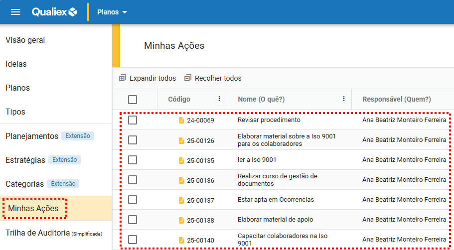 A aba "Minhas Ações" funciona como um atalho para acompanhar e gerenciar todas as suas ações em um só lugar, além de centralizar ações provenientes de outros módulos que também são exibidas na listagem.
