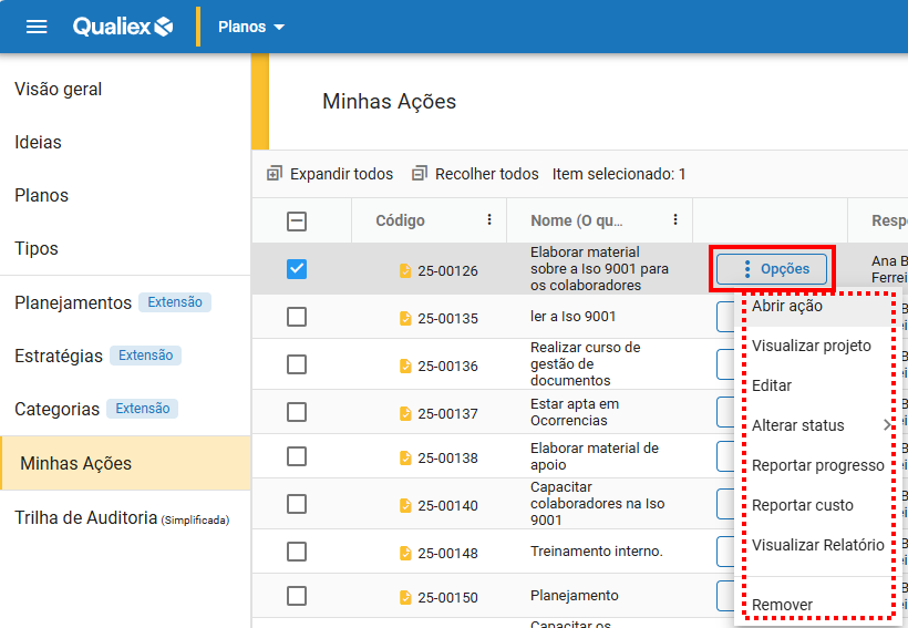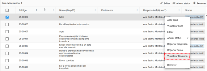 - Visualizar projeto: abre o projeto ao qual a ação pertence, permitindo visualizar o contexto geral.