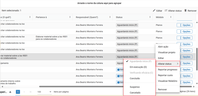 - Alterar status: atualiza o status da ação (ex: de "Em execução" para "Concluído").