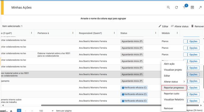 - Reportar progresso: registra o avanço da ação, incluindo percentual de conclusão e comentários.