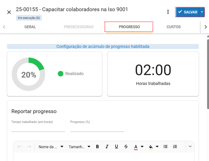 Conseguimos também reportar progresso sem sair desta aba, com o menu aberto clique em "Reportar progresso" e será aberta a aba de progresso da ação.