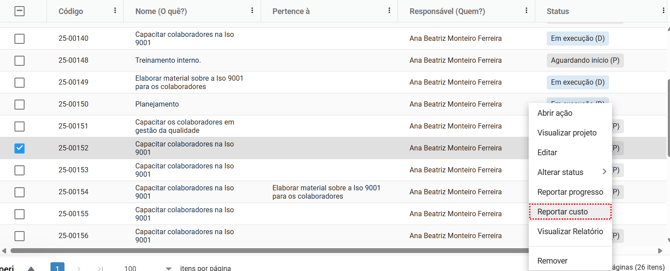 Também é possível reportar o custo das suas ações diretamente pelo menu de contexto: basta clicar em “Reportar custos” e uma nova aba será aberta para que você registre o valor correspondente à ação selecionada.