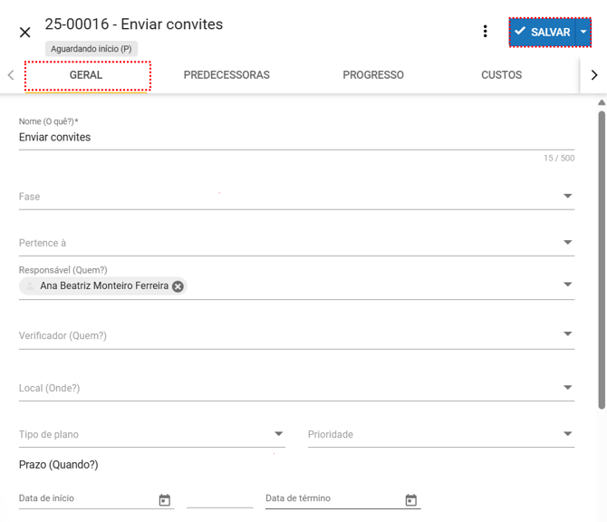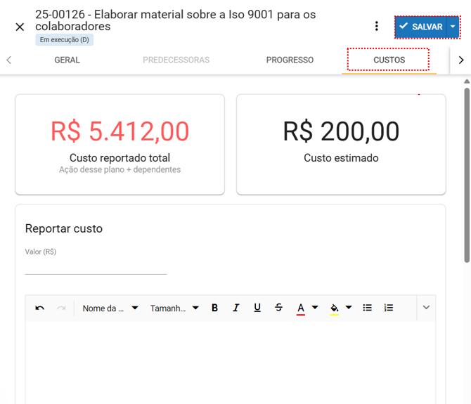 - Reportar custos: insere informações sobre os custos envolvidos na execução da ação.