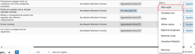 - Abrir ação: acessa a tela completa da ação, com todos os detalhes e funcionalidades disponíveis.