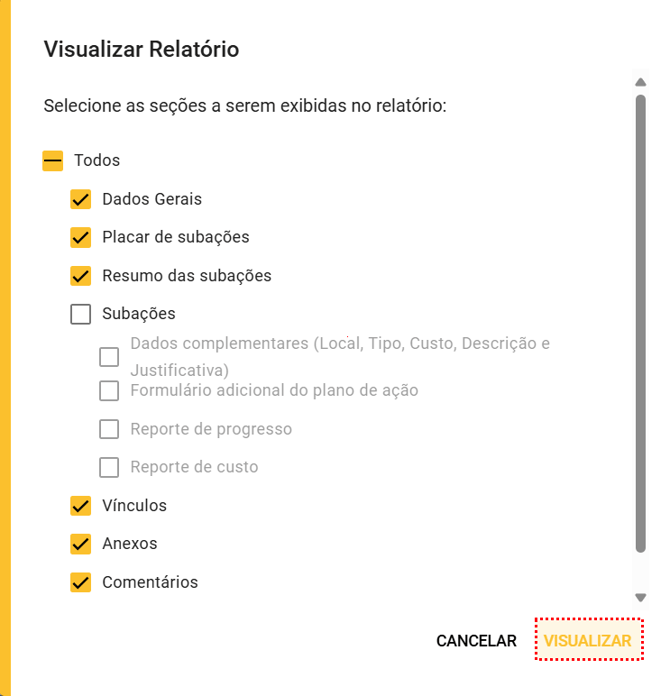Podemos também visualizar o relatório, com o menu aberto selecione "Visualizar Relatório", será aberto uma aba para selecionar as seções que você deseja exibir no relatório: