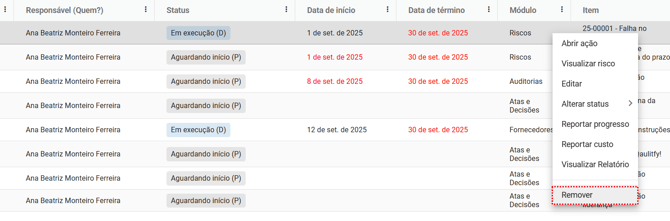 - Editar: permite modificar os dados da ação, como nome, responsável, prazos e status.