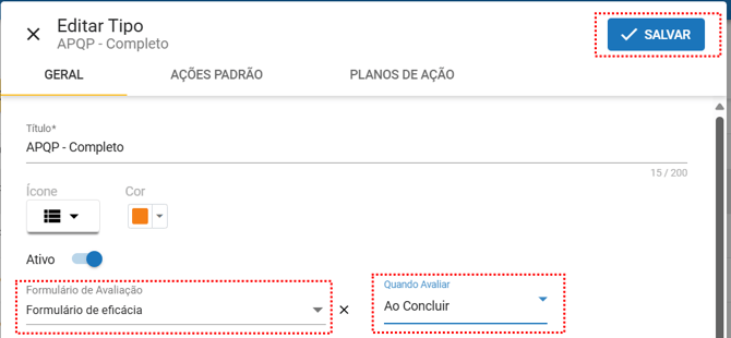 Vincule o formulário que foi cadastrado no campo "Formulário de Avaliação". E defina "Quando avaliar" podendo ser "Não definido", "Ao Concluir", "Depois de 1 mês", "Depois de 2 meses", "Depois de 3 meses", "Depois de 6 meses". Após as alterações, clique em "Salvar"