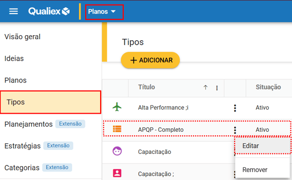 Na aba de "Tipos" do módulo "Planos", será possível vincular o formulário criado. Clique para editar um tipo já cadastrado.
