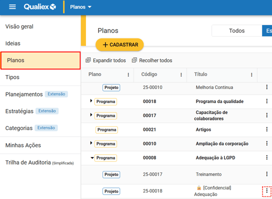 Chegamos na avaliação! Agora, na aba "Planos" ainda no módulo "Planos" vamos abrir o menu contexto do projeto que desejamos avaliar, clicando com o botão direito do mouse em cima do mesmo ou clicando no ícone