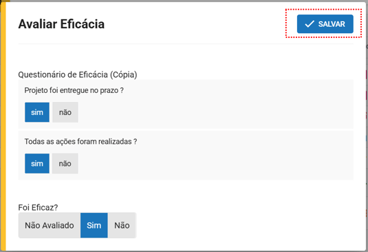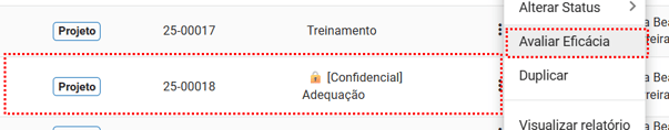 Apenas o avaliador designado para o projeto pode realizar a verificação de eficácia