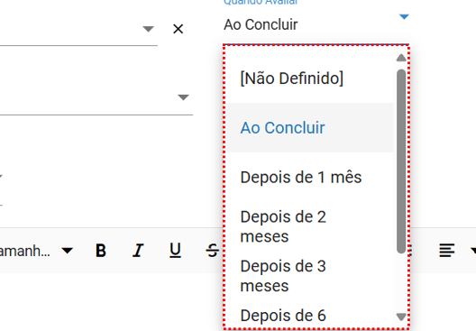 Vincule o formulário que foi cadastrado no campo "Formulário de Avaliação". E defina "Quando avaliar" podendo ser "Não definido", "Ao Concluir", "Depois de 1 mês", "Depois de 2 meses", "Depois de 3 meses", "Depois de 6 meses". Após as alterações, clique em "Salvar"