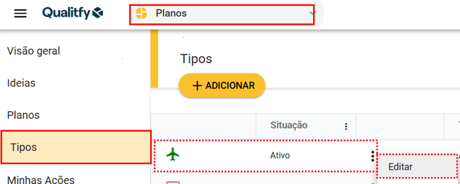 Na aba de "Tipos" do módulo "Planos", será possível vincular o formulário criado. Clique para editar um tipo já cadastrado.
