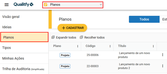 Na aba "Planos" ainda no módulo "Planos" vamos abrir o menu contexto do projeto que desejamos avaliar, clicando com o botão direito do mouse em cima do mesmo ou clicando no ícone