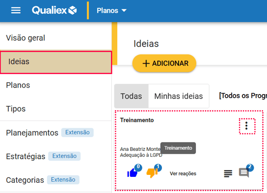 Para que a ideia seja convertida em projeto, acesse o menu de contexto da ideia que já foi cadastrada