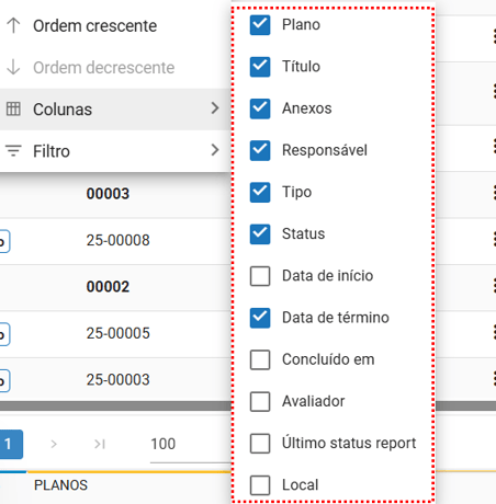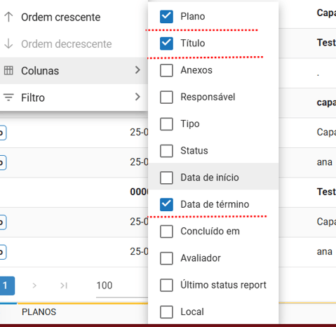 As colunas que temos disponíveis são: "Plano", "Título", "Anexos", "Responsável", "Tipo", "Status", "Data de início", "Data de término", "Concluído em", "Avaliador", "Último status report", "Local".