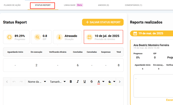 - Através da aba "Status Report"