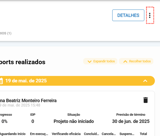 Você pode visualizar essa informação no seu projeto acessando a aba "Status Report" ou pela opção "Detalhes".