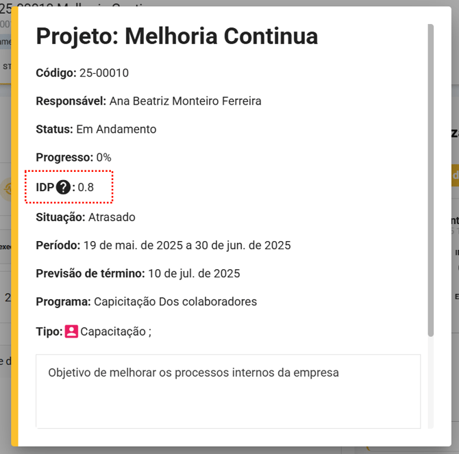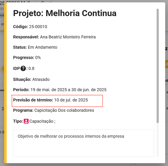 O módulo Planos consegue estimar uma previsão de término para o projeto, isto é calculado considerando a duração total do projeto, o IDP atual e a data de início do projeto. Esta previsão de término varia conforme as ações do projeto forem realizadas.