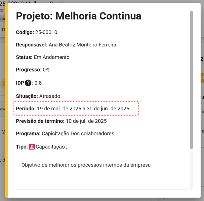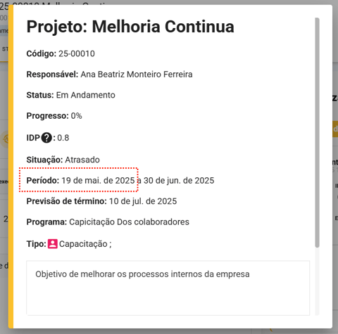 - Também conseguimos visualizar essa informação através do período em "Detalhes" do projeto. É a primeira data exibida!