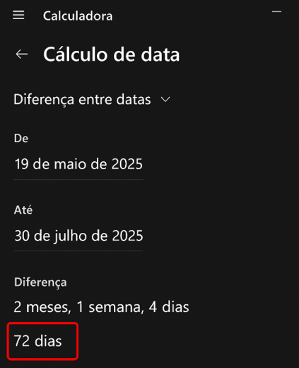 - Através da aba de Detalhes conseguimos visualizar que devemos calcular a diferença entre o dia 19 de maio de 2025 e o dia 30 de julho de 2025.
