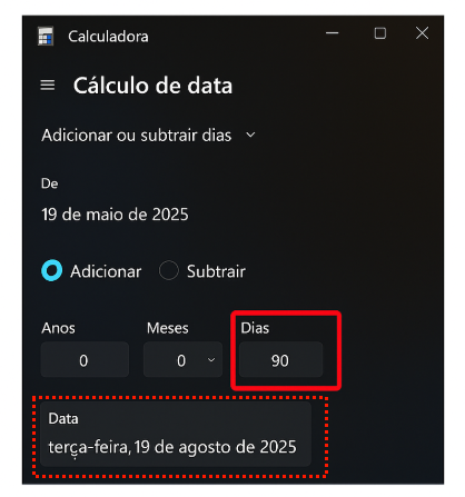 - Agora vamos somar 90 dias a partir da data de início do projeto: