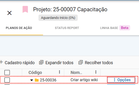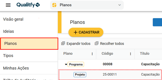 Para acessar a ação. Acesse a aba "Planos", e abra o projeto que deseja editar o custo da ação.
