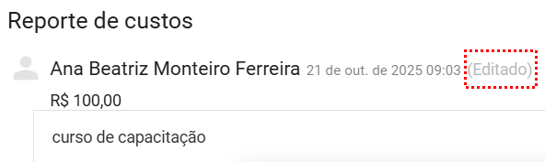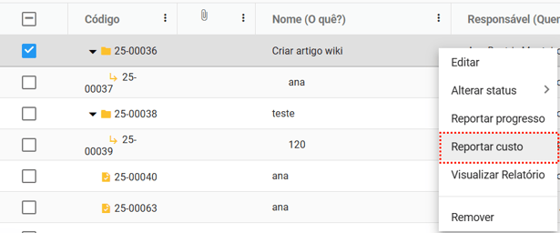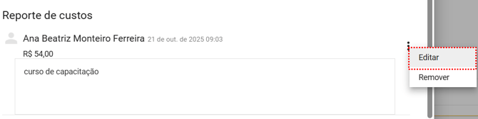 Ao abrir a ação, é possível editar o custo. Em "Reporte de custos", acesse o custo que foi reportado e clique no menu de contexto do custo que deseja editar e vá em "Editar"