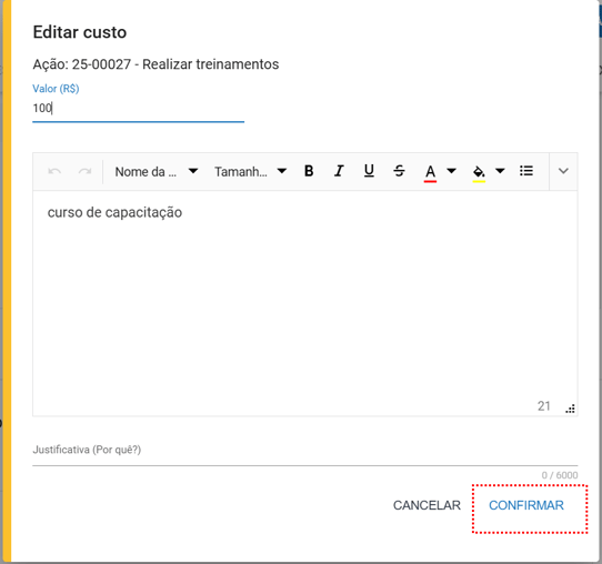 Em situações onde o valor ou a descrição de um custo reportado precisa ser ajustado, o sistema permite a edição do custo vinculado a uma ação dentro de um projeto.