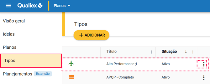 Para editar um tipo, acesse a aba "Tipos", selecione o tipo desejado e clique no menu de contexto
