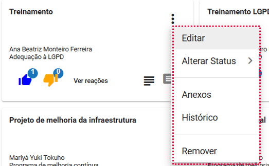 Através do menu de contexto os usuários com permissão (emissor da ideia ou quem possui “Editar Todos”) podem realizar diversas ações: