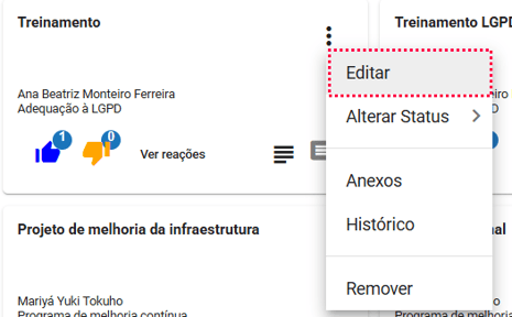 Para visualizar ou editar as informações de uma ideia, no menu contexto da ideia clique na opção "Editar"