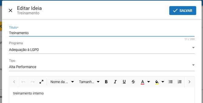 - Após selecionar a opção editar, abrirá o menu de edição, você pode visualizar os detalhes da ideia e até mesmo altera-los