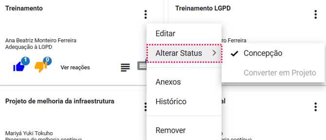 Para alterar o status de uma ideia, no menu contexto da ideia clique na opção "Alterar Status"
