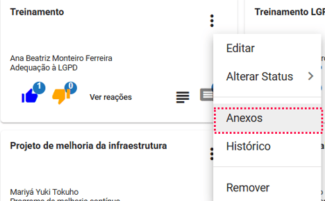 Para inserir e visualizar anexos em uma ideia, no menu contexto da ideia clique na opção "Anexos"