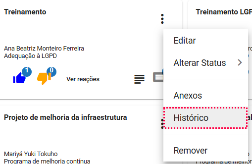Para visualizar o histórico de uma ideia, no menu contexto da ideia clique na opção "Histórico"