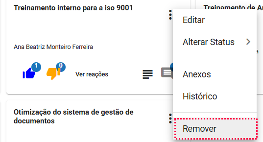 Para excluir uma ideia, no menu contexto da ideia clique na opção "Remover"