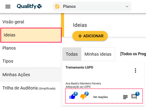 No módulo "Planos", vá na aba "Ideias". Podemos visualizar todas as ideias já cadastradas e na parte de baixo das ideias podemos reagir.