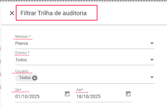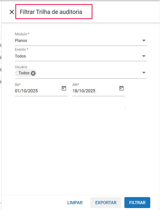 - Exportar : os dados filtrados nos formatos CSV, PDF ou XLSX (desde que o usuário tenha a permissão de Baixar trilha de auditoria).