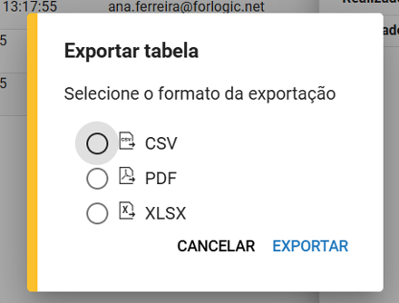 Além disso, é possível exportar os dados de um evento específico diretamente da janela de detalhes, também nos formatos CSV, PDF ou XLSX.