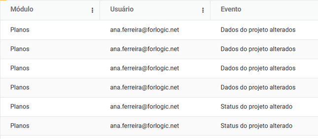 Para acessar a trilha de auditoria no Planos, entre no módulo pelo menu e selecione a aba “Trilha de auditoria (simplificada)”. Nesta aba, você encontrará as seguintes colunas: